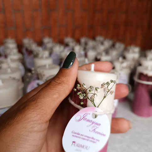 A parte superior é feita com cera aromática, cada vela acompanha uma teg personalizada conforme o evento (casamento, batizado, aniversário, etc.), além de um delicado arranjo de flores secas e amarração com barbante de sisal.